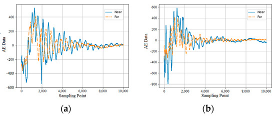 Example of single waveform acquisition results for near-end and far-end AE sensors. (a) A typical test waveform of Metasequoia trunk with 10% moisture content; (b) a typical test waveform of Metasequoia trunk with 20% moisture content.