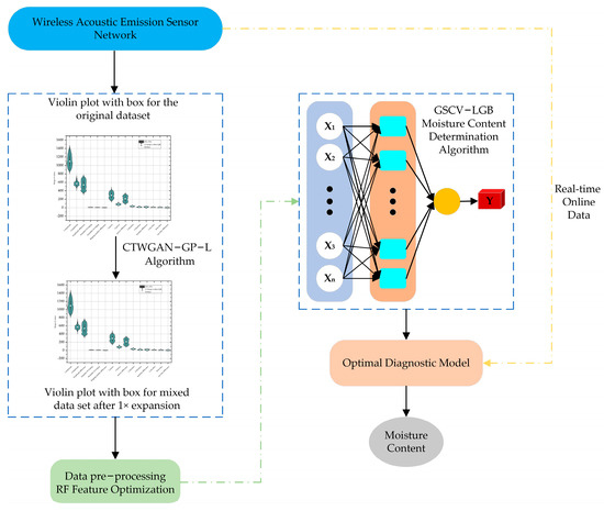 The offline expansion of the dataset in the framework is performed in the server, while the online identification is performed on different species of trees by the WASN sensor system: first, the mixed sample dataset is pre-processed and normalized dimensionless by the CTWGAN-GP-L algorithm after a 1× expansion; then the most representative seven feature vectors are filtered based on the moisture content data labels of the prepared samples; the optimal diagnostic model is then trained using the GSCV-LGB algorithm; finally, the AE signal data collected in real time are input to the diagnostic model in order to adapt it to calculate its current moisture content value.