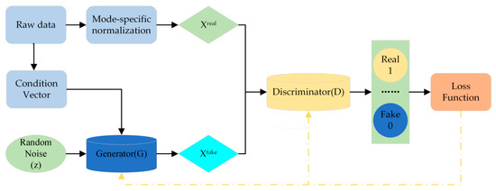 CTGAN algorithm model was proposed by Lei Xu et al. in 2019 [18]. Before this algorithm was proposed, Lei Xu et al. also proposed the Tabular GAN (TGAN) algorithm model [19], but the quality of the generated data was not high in this algorithm model due to the lack of conditions as a guide to generate the data; however, in CTGAN normalization for patterns was invented to overcome the non-Gaussian and multi-modal distributions. The difference between the CTGAN and normal Generative Adversarial Network (GAN) network structure is shown in Figure 8.