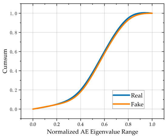 Vision is a very powerful tool in human verification of results and pattern recognition, so visual evaluation plays a crucial role in the evaluation process of the model. Stavroula Bourou et al. used one discrete feature and two continuous features to perform a plot analysis of the cumulative sum of the original and synthetic data [23], but they only examined the distribution between the columns for a particular column or columns of similarity. In this paper, I innovatively integrate the 15 columns of AE features in the 1× data generated by the CTWGAN-GP-L algorithm and the 15 columns of AE features in the original data by normalizing them separately in a single plot for overall accumulation and analysis, where the statistics of the real data are marked in blue and the statistics of the synthetic data are marked in orange, and the displayed results are shown in Figure 11.