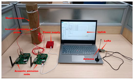 The WASN node used in this paper uses the UT-1000 acoustic emission sensor (MISTRAS Group, Inc., Princeton Jct, NJ, USA) of American Physical Acoustics to collect the acoustic emission signal of wood samples, and through the OPA627 operational amplifier chip (Texas Instruments Inc., Dallas, TX, USA), the acoustic emission raw signal is amplified and processed, then the AD7356 chip (Analog Devices, Inc., Norwood, MA, USA) is used to convert the acoustic emission signal analog to digital. Furthermore, the acoustic emission signal is read by the STM32F405RG chip (STMicroelectronics, Geneva, Switzerland) based on the Cotex-M4 core. Finally, after data pre-processing and data storage, the acoustic emission signal data are sent to the gateway via the SX1278-based LoRa module (SEMTECH Corporation, Camarillo, CA, USA). The composition and interconnection of each module of the node are shown in Figure 2, and the physical sample and installation measurement example are shown in Figure 3.