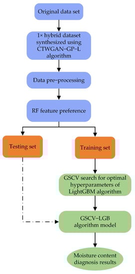 Figure 19 shows the optimization of the LightGBM hyperparameters by the GridSearchCV algorithm and the process of building a moisture content diagnostic model using the optimized GSCV-LGB algorithm. After the aforementioned feature selection and sample set determination, the optimal hyperparameters of the LightGBM algorithm can be found within the specified parameter range; the optimal hyperparameters are then substituted back into the LightGBM algorithm, and finally, the GSCV-LGB moisture content diagnostic model is obtained for real measurement.