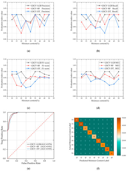 Then, it can be seen from Figure 21d that the MCC value of the GSCV-LGB algorithm is lower than that of the GSCV-RF algorithm except for the value of the moisture content label of 25%, and the value of the moisture content label of 10% is lower than that of GSCV-DT algorithm; in addition, the MCC value of moisture content label of 30% is consistent with that of the GSCV-RF algorithm and GSCV-DT algorithm. The MCC value of the GSCV-LGB algorithm is higher than that of the GSCV-RF algorithm and GSCV-DT algorithm in all other cases.