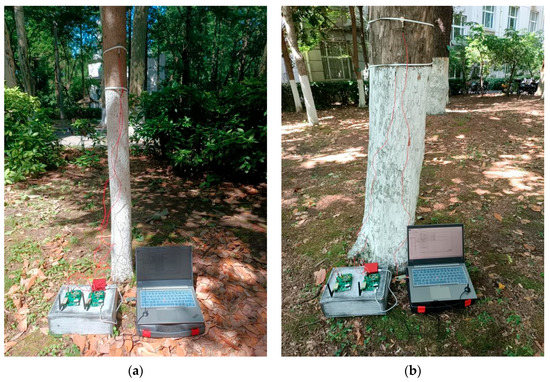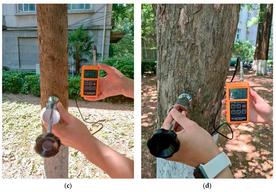 In order to verify the effectiveness of the moisture content diagnostic method designed in this paper on different standing trees, AE data were collected for analysis in field tests on standing trees such as magnolia, zelkova, triangle maple, zhejiang nan, ginkgo, and yunnan pine on the South Forest campus and then use KT-80 high-precision moisture tester imported from Italy for multi-point average calibration (measuring moisture content of 44.5%, 22.0%, 37.5%, 48.7%, 38.6%, 49.3%, respectively); the installation test and calibration plots for zhejiang nan and triangle maple are shown in Figure 22a–d, respectively.