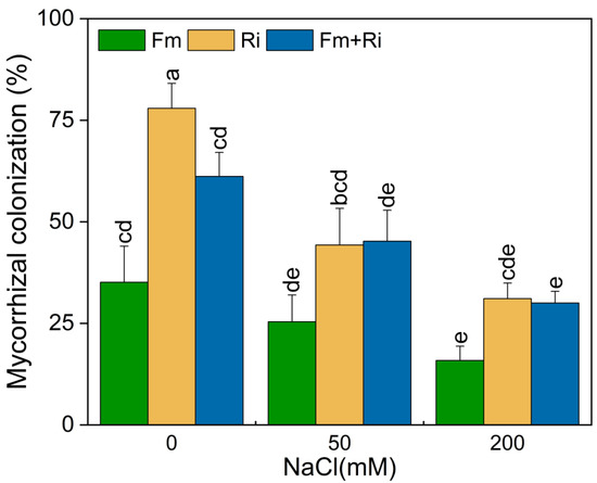 Mycorrhizal colonization in the root systems of Cinnamomum camphora plants under 0, 50 and 200 mM NaCl. Fm, Ri, and Fm+Ri represent the three mycorrhizal treatments: inoculation with sterilized mycorrhizal fungi, with Funneliformis mosseae or Rhizophagus irregularis, either alone or in combination, respectively. Values are presented as the mean ± SE (n = 3). Different lowercase letters indicate a significant difference according to LSD at p < 0.05.