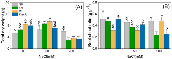 Effects of arbuscular mycorrhizal fungi on total dry weight (A) and root:shoot ratio (B) of Cinnamomum camphora plants under 0, 50, and 200 mM NaCl. NM, Fm, Ri, and Fm+Ri represent the four mycorrhizal treatments: inoculation with sterilized mycorrhizal fungi, with Funneliformis mosseae or Rhizophagus irregularis, either alone or in combination, respectively. Values are presented as the mean ± SE (n = 6). Different lowercase letters indicate a significant difference according to LSD at p < 0.05.