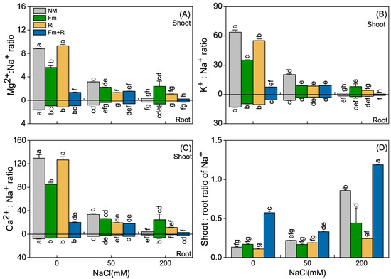 Effects of arbuscular mycorrhizal fungi on Mg2+:Na+ ratio (A), K+:Na+ ratio (B), Ca2+:Na+ ratio (C) in shoots and roots, and shoot:root ratio of Na+ (D) of Cinnamomum camphora plants under 0, 50, and 200 mM NaCl. NM, Fm, Ri, and Fm+Ri represent the four mycorrhizal treatments: inoculation with sterilized mycorrhizal fungi, with Funneliformis mosseae or Rhizophagus irregularis, either alone or in combination, respectively. Values are presented as the mean ± SE (n = 3). Different lowercase letters indicate a significant difference for means of either root or shoot according to LSD at p < 0.05.
