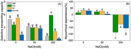 Effects of arbuscular mycorrhizal fungi on selective transporting capacity (STC) (A) and mycorrhizal dependence (MD) (B) of Cinnamomum camphora plants under 0, 50, and 200 mM NaCl. NM, Fm, Ri, and Fm+Ri represent the four mycorrhizal treatments: inoculation with sterilized mycorrhizal fungi, with Funneliformis mosseae or Rhizophagus irregularis, either alone or in combination, respectively. Values for STC are presented as the mean ± SE (n = 3), and those for MD are stated as the mean ± SE (n = 6). Different lowercase letters indicate a significant difference according to LSD at p < 0.05.