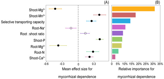 Mean effect sizes of observed variables on mycorrhizal dependence (MD) (A) and their relative contributions to variances of MD (B) in Cinnamomum camphora following partial regression. Abbreviations are as follows: shoot-Mg2+, Mg2+ concentration in shoot; shoot-Mn2+, Mn2+ concentration in shoot; STC, selective transporting capacity of K+ over Na+ from roots to shoots; root-Na+, Na+ concentration in root; shoot-P, P concentration in shoot; root-Mg2+, Mg2+ concentration in root; root-N, N concentration in root; shoot-Ca2+, Ca2+ concentration in shoot.