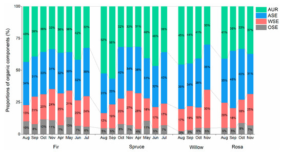 The fractions of ASE and AUR were the main components among all plant species. In rosa litter, the content of ASE (37.62%) was higher than that of other C fractions, while in fir, spruce and willow litter, the content of AUR was higher than that of other C fractions (fir: 37.05%; spruce: 41.45%; willow: 40.04%) (Table 1). ASE and AUR were significantly affected by the collection time (ASE: p = 0.015; AUR: p = 0.003) and plant species (ASE: p = 0.020; AUR: p < 0.001) (Table 2). Regarding WSE, similar trends were observed between the fir and spruce litter materials, with peaks occurring in April (Figure 1). Regarding AUR, the content in fir, willow and rosa litter generally decreased from August to November (Figure 1).
