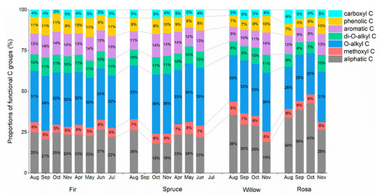 Aliphatic C and O-alkyl C were the main functional C groups, while methoxyl C and carboxyl C were less abundant than the other functional groups (Table 1). In rosa litter, the content of aliphatic C (35.44%) was higher than that of the other functional C groups, while fir, spruce and willow litter contained more O-alkyl C (fir: 32.03%; spruce: 35.02%; willow: 32.34%). The plant species (p < 0.001) and collection time (p < 0.01) remarkably affected the functional C groups (Table 2). Smaller proportions of O-alkyl C in the fir and spruce litter samples were observed in April (Figure 2). The aromatic C and phenolic C contents in the fir and spruce litter samples remained stable with low proportions (Figure 2). The aliphatic C content in willow litter continuously decreased from August to November, while the aliphatic C content in rosa litter increased from August to October (Figure 2).