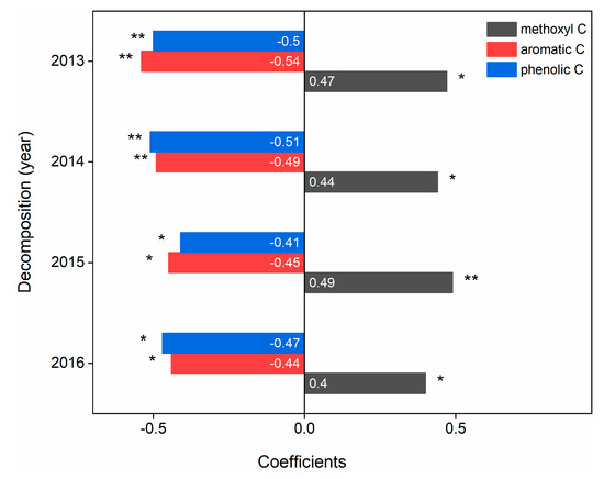 Among all the functional C groups, methoxyl C, aromatic C and phenolic C significantly (p < 0.05) affected C loss during litter decomposition. Methoxyl C (coefficient: 0.49) and aromatic C (coefficient: −0.54) markedly controlled C loss in the third and first years of litter decomposition, respectively, and phenolic C significantly controlled C loss in both the second (coefficient: −0.51) and fourth (coefficient: −0.47) years of litter decomposition (Figure 4).