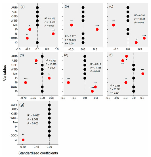 Results of stepwise regression analysis of the functional C groups ((a): aliphatic C, (b): methoxyl C, (c): O-alkyl C, (d): di-O-alkyl C, (e): aromatic C, (f): phenolic C, and (g): carboxyl (C)) using the litter quality (C: carbon; DOC: dissolved organic carbon; N: nitrogen; P: phosphorus; Mn: manganese; WSE: water-soluble extractives; OSE: organic-soluble extractives; ASE: acid-soluble extractives; AUR: acid-unhydrolyzable residues). The dominant variables are emphasized in red in the regression model. The values represent standardized coefficients, and the * indicates significant effects of the variables on the functional C fractions in a given regression model * p < 0.05, ** p < 0.01, and *** p < 0.001. For example, aliphatic C was significantly impacted by P (p < 0.05), DOC (p < 0.01) and N (p < 0.001) in the stepwise regression testing the effects of litter chemical quality on aliphatic C (a).