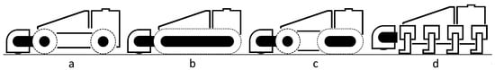 - Iwamoto, T.; Yamamoto, H. Mechanical Design of Variable Configuration Tracked Vehicle. ASME. J. Mech. Des. 1990, 112, 289–294. [Google Scholar] [CrossRef]