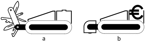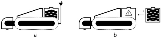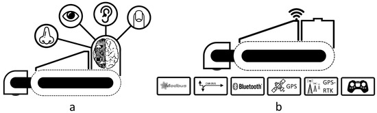 - Remote-controlled: This involves remote operation by means of a remote control as shown in Figure 7a. It allows the operator to be taken away from the action, which gives him greater protection against any type of dangerous event in the vicinity of the operation [62]. These MPs may have sensors and safety systems that alert the operator to events that may be unknown to him and that may lead to some dangerous operation.