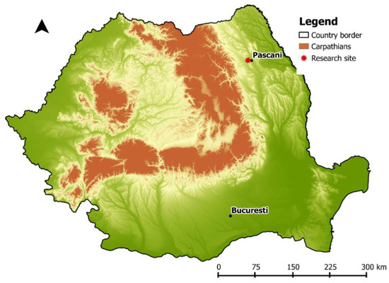 Research was conducted in a mixed deciduous species forest located on a hilly region near the town of Pașcani (Iași County, northeastern part of Romania; Figure 1). Altitudes range from 280 to 300 m a.s.l., slopes are between 0 and 20 degrees, and the aspects are mostly sunny (S, S-E, S-W, E, W- [31]). The mean annual temperature is 8.4 °C, and the mean annual precipitation is 559 mm [32].