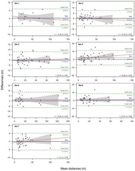 The largest bias occurred for dataset 4, which also included the largest number of nests. The limits of agreement (LoA) were within the GNSS accuracy range (±10 m) with only one exception (set 4, for which also the highest mean difference was recorded).