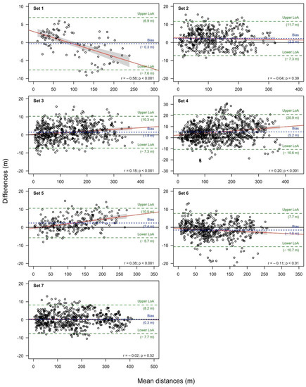 Results of the Bland–Altman analysis and linear regression for the datasets, including all distances between points (nests). Note: the red line shows the regression between bias and mean differences.