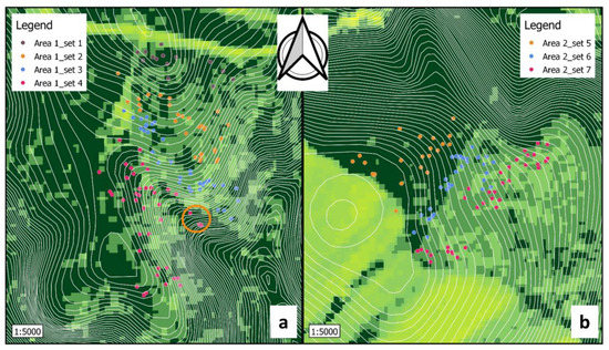 The terrain configuration revealed by the digital model and the canopy density revealed by the EVI classified image for the two analyzed areas (a—datasets 1 to 4; b—datasets 5 to 7). Nuances of green represent different canopy densities (with light green for open space and darkest green for fully closed dense canopy). The orange circle on the left image shows examples of nests located both under dense canopies and under steep terrain conditions.
