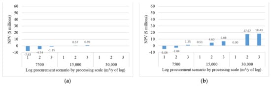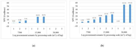 | Parameter | Level | NPV ($ Millions) by Processing Scale (m3/y of Log) and Log Procurement Scenario | ||||||||