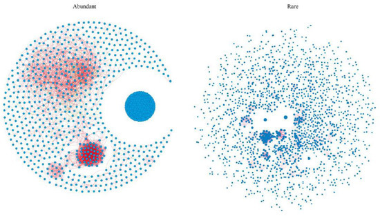 Based on the Spearman correlation coefficients (|R| > 0.65, p < 0.001), we constructed the co-occurrence networks of abundant and rare bacterial OTUs (Figure 3). The counts of positive correlations in the co-occurrence networks of both abundant and rare bacteria were over 95%. This indicated that cooperation within abundant or rare taxonomic bacterial communities could contribute to resisting environmental stresses during the development of P. massoniana. The network diameter, modularity, average degree, and average path length of the abundant bacterial co-occurrence network were lower than those of the rare groups. However, the abundant bacteria exhibited a clustering coefficient and graph density than the rare bacteria (Table 2). These differences in network topology characteristics indicated that rare taxa have a greater network scale and complexity and more sensitivity to the environment than abundant taxa. However, there was a higher degree of aggregation of abundant bacterial taxa, which may contribute to buffer the environmental stress.