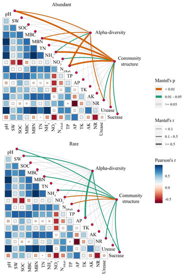 Partial Mantel correlation test between the soil physicochemical properties and bacterial α−diversity and composition for abundant and rare bacterial taxa. Community diversity includes OTU richness, the Shannon index, and the Pilou index. Community structure was expressed as PC1 and PC2 of the PCoA results of abundant and rare bacterial taxa. The width of the edges represents the R2 of the Mantel test. The colors represent the p-values, which were based on 999 permutation tests. SW: soil water content; MBC: microbial biomass carbon; MBN: microbial biomass nitrogen; SOC: soil organic carbon; TN: total nitrogen; N alkali: alkali nitrogen; TP: total phosphorus; AP: available phosphorus; TK: total potassium; AK: available potassium; NR: nitrite reductase.