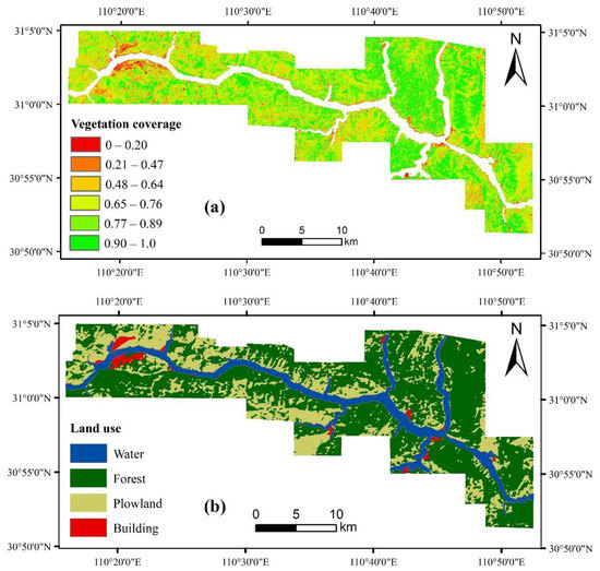 - Land cover includes land use and vegetation coverage in this study. Land use is an indicator of the intensity of human activity. In regions where human activities are violent, slope instability rises. Land uses are exacted by pixel classifications from Landsat 8 OLI images and they are then validated by a public dataset [55]. The overall validation accuracy of land use is 89.8%. To make the land use results more reliable, visual interpretation is used to correct misclassifications. Plant roots hold soil and rock in place, and absorb water in the soil at the same time. It usually exerts a positive effect on landslides [56]. The vegetation coverage is computed based on the dimidiate pixel model and normalized difference vegetation index (NDVI).