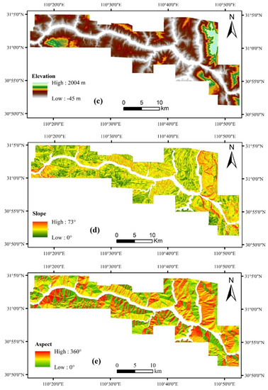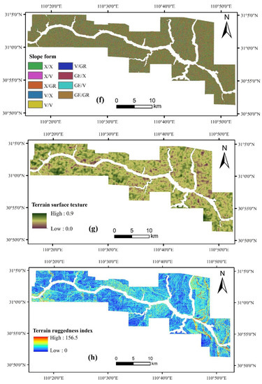 - Topography is an essential condition to control the development of landslides [56]. The slope, aspect, slope form, terrain surface texture, terrain ruggedness index, and topographic curvature are derived from the elevation. It must be noted that the bedding structures are a combination of topographic conditions and geological conditions. The bedding structures are classified into six types according to the previous literature [57].