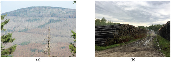 Calamity timber (a) Norway spruce forests in the Harz mountains, Germany, after severe attack by bark-breeding beetles (Photo: S. Bollmus, 2021); (b) Sprinkling of spruce logs in a wet storage near Glashütte, Lower Saxony, Germany (Photo: L. Emmerich, 2019).