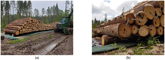 Due to the partly very difficult sales situation in 2018, options for long-term storage and preservation have been sought. In particular, less durable spruce wood requires special protective measures if it needs to be stored outdoors for a period of many months to several years with as little loss in quality as possible. Traditionally, this is conducted by wet storage either in waterbodies or by sprinkling (Figure 1b). The permanent sprinkling reduces oxygen content in the wood to such an extent that wood-destroying fungi do not degrade the wood [2,3,4,5]. Due to the persistent drought in the summers of 2018 to 2020, however, the water supplies required for such irrigation were not available in many places. In addition, the establishment of wet storage areas is expensive and time-consuming to apply for; therefore, it often cannot be realized in the short term.