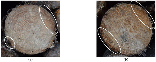 Assigning log cross-sections to quality classes according to RVR [4]. (a) B/C quality with acceptable rot spots at the edge of the cross-section; (b) D quality log with signs of softening due to brown rot.