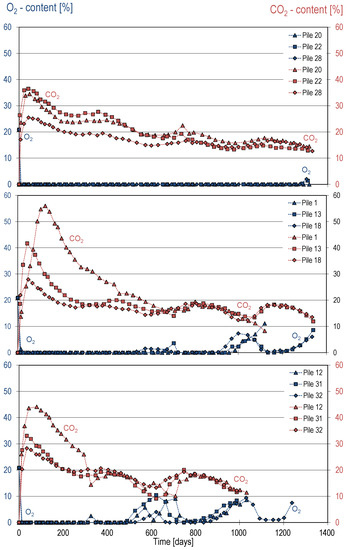 The interior atmosphere of the foil piles was differently favorable for the growth of microorganisms over the storage period and between the piles. As a result, the risk to the stored wood fluctuated greatly in some cases. In borderline cases, i.e., when there was a sharp increase in O2 content, which could not be reduced again by simple repairs, piles were also broken up prematurely. Basically, the piles examined could be assigned to three categories, which are shown in Figure 5 as examples of three piles each: