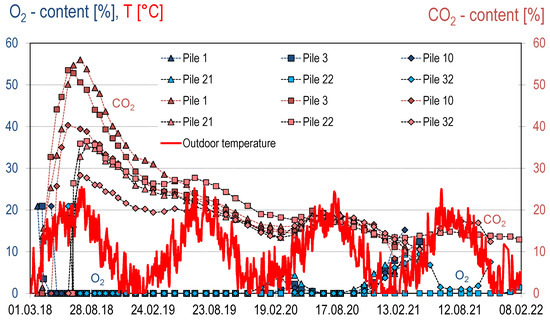 The connection between the temperature of the outside air and the CO2 content, which is shown for a total of six piles in Figure 6, was striking in many foil piles. The temperature data were recorded by a weather station in Delliehausen/Uslar. After closing the foil, a strong increase in CO2 content was observed in all piles, which was apparently not influenced by the respective outside temperature. Between June and August 2018, the CO2 level reached a maximum, followed by a slow decrease over the following years, probably as a result of the decreasing numbers of living cells and microorganisms in the pile. In the following years, the higher summer temperatures led to a renewed increase in CO2 content, which in turn can be explained by increased biological activity. The foil is not completely impermeable for gases, and it is more permeable for CO2 compared to O2 which, in combination with the still physiologically active microorganisms, explains the fluctuations in CO2 content over the months as similarly observed in previous studies [10].
