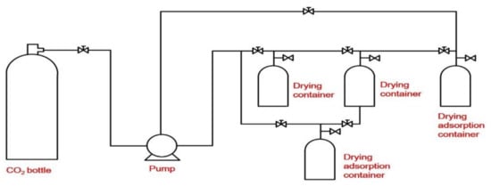 The supercritical CO2-drying system used in this experiment was the DY221-50-06, which was produced by Nantong HuaAn Supercritical Fluid Extraction Co., Ltd. (Nantong, China). Its structure consists of three parts: a circulating pump, drying adsorption container, CO2 bottle, and drying containers (5 L and 2 L), as shown in Figure 1. The PEG4000-impregnated specimens were placed in the drying container and sealed. Liquid CO2 was pumped into the drying container, then the pressure and temperature were increased to 30 MPa and 40 °C for 30 min, saturating the sample with liquid CO2 before slowly reducing the pressure to the ambient pressure. As the pressure was reduced, the supercritical CO2 was converted into gas, which carried water with it, removing it from the specimen.