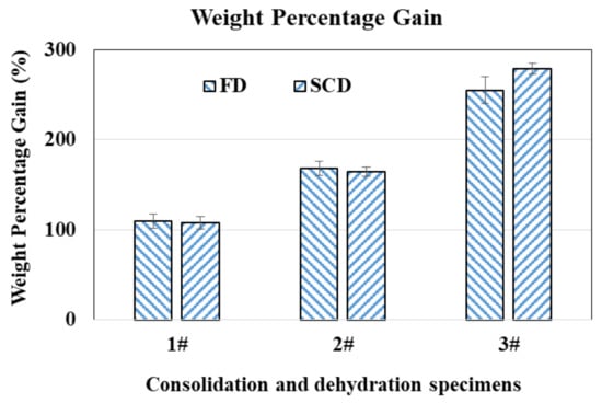 WPG is based on the net weight gain of the waterlogged archaeological wood after PEG4000 impregnation, which depends on the permeability of the PEG4000 solution into the wood. Figure 2 presents the results of WPG after consolidation and dehydration. After comparisons of archaeological wood in different deterioration states, the most deteriorated sample (3#) had the largest WPG value (255%–278%), while the WPG of the specimens from the least deteriorated wood sample (1#) was only 107.79%–109.33%. This indicated that while the degradation of cellulose and hemicellulose weakened the cell wall strengths, it also improved the permeability, resulting a better accessibility of the cell walls for PEG4000. Comparing with specimens from FD and SCD groups, dehydration had no significant effect on effect on the weight percentage gain.