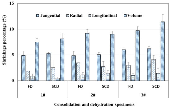 Shrinkage is a characteristic of the wood-drying process, whether for sound wood or waterlogged archaeological wood. Wood is an anisotropic material and exhibits different shrinkage percentages in the tangential, radial, and longitudinal directions. According to data from the wood database, the shrinkage percentage of Scots pine in the tangential and radial directions is 8.3% and 5.2%, respectively, and 13.6% in volume, with a tangential/radial shrinkage rate ratio of 1.6. The observed shrinkage percentages of specimens are shown in Figure 3, and after consolidation and dehydration, the shrinkage in the tangential direction was 4.86%–6.21%, in the radial direction was 1.87%–4.16%, and in volume was 7.49%–11.42%, with a tangential/radial shrinkage rate ratio of 1.4–2.6. This revealed that PEG4000 effectively prevented shrinkage of cell walls during drying, resulting in smaller shrinkage rates in waterlogged archaeological wood than in sound wood. By comparing among the shrinkage ratios of the specimens after treatment by two different dehydration methods, the shrinkage ratio of the specimens treated with vacuum freeze drying was slightly smaller, which may have been because the specimens slightly expanded after 12 h at −50 °C, and their volume decreased very little after sublimation of the solid water. Shrinkage of specimens from samples 2# and 3# was greater than that of specimens from sample 1#, illustrating that specimens with higher degrees of deterioration had higher shrinkage percentages due to their weakened cell walls.