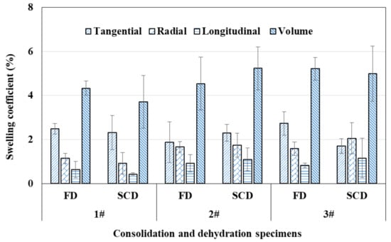 Dimensional stability is an important factor for wooden relics since changes in dimensions will lead to deformation or cracking, affecting their preservation and exhibition [35]. The swelling coefficients of specimens from the three wood samples with different degrees of degradation are presented in Figure 4. The swelling coefficients for volume reflect the volumetric swelling (3.71%–5.24%), which was much higher than the swelling coefficients in the tangential, radial, and longitudinal directions. Similarly, the sound wood swelling coefficient in the longitudinal direction (0.43%–1.16%) was much smaller than those in the tangential (1.70%–2.73%) and radial (0.92%–2.06%) directions. Among the swelling coefficients of specimens from different wood samples, the values from sample 3# were higher than those from samples 1# and 2#. There were no significant differences in the swelling coefficients between the two different dehydration methods.
