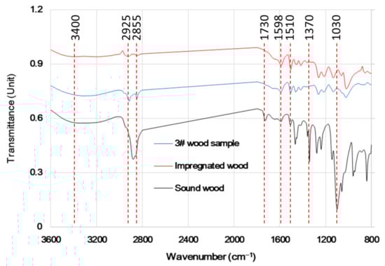 Figure 6 presents the FTIR spectra of sound wood, sample 3# wood, and a wood specimen immersed in PEG4000. Compared to the spectrum of sound wood, the spectrum of the sample 3# wood had clear differences. There were elevated peaks at around 1730 cm−1 related to the C=O tensile vibration of xylan and around 1370 cm−1 related to CH deformation (symmetric) in carbo-hydrates, but the peaks belonging to the stretching vibration of the carbon-oxygen double bond of xylan acetyl group (CH3C=O) were tiny or absent, indicating that the cellulose and hemicellulose contents in the waterlogged archaeological wood samples were low [36,37,38]. In contrast, the peaks at 1598 cm−1 corresponding to C=C stretching of the aromatic ring (lignin) [39] were slightly elevated in the deteriorated wood, while the peaks around 1510 cm−1 were not much different, indicating that the content of lignin in the ancient wood had increased [40], which meant that the lignin had only slightly degraded during the deterioration process, which was consistent with previous findings [34,41,42,43]. In the spectra of the PEG4000 immersed wood, the band at 3400 cm−1 corresponding to the stretching vibration of hydroxyl (-OH) [44,45,46,47,48] decreased notably; these groups are related to the hydrophilic chemical composition and may be why the dimensional stability was improved.