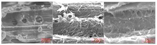 SEM micrographs of the specimens in the untreated and impregnated groups are presented in Figure 7. PEG4000 was found to be fully integrated throughout the specimen structure. It was evident that thick PEG4000 had attached to the tracheid walls of the specimens, preventing MA in the conditions in which the archaeological wood was placed, which improved its dimensional stability. PEG4000 could, therefore, reduce MA when it covered intrinsic layers of archaeological wood, thereby enhancing wood dimensional stability.