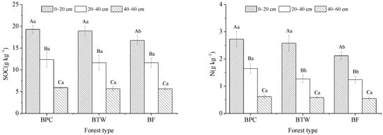 SOC and N concentrations in BPC, BTW, and BF. Capital letters indicate the differences between different soil depths in the same forest type, and lowercase letters indicate the differences between different forest types at the same soil depth. BF, BPC, and BTW represent pure moso bamboo forest, bamboo forest interplanted with Phoebe chekiangensis, and bamboo forest interplanted with Taxus wallichiana var. maireii, respectively.
