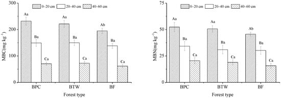 MBC and MBN concentrations in BPC, BTW, and BF. Capital letters indicate the differences between different soil depths in the same forest type, and lowercase letters indicate the differences between different forest types at the same soil depth. BF, BPC, and BTW represent pure moso bamboo forest, bamboo forest interplanted with Phoebe chekiangensis, and bamboo forest interplanted with Taxus wallichiana var. maireii, respectively.