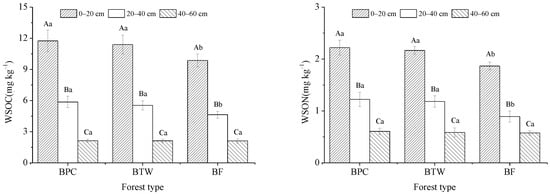 Details about the WSOC and WSON concentrations for each treatment are shown in Figure 3. At depths of 0–20 and 20–40 cm, the WSOC and WSON concentrations in BPC and BTW were significantly higher than in BF (p < 0.05), while no significant difference was found between BPC and BTW (p > 0.05). At a depth of 40–60 cm, there was no significant difference between the three forest types (p > 0.05). Soil WSOC and WSON concentrations also decreased with increasing soil depth in all three forest types, and the differences were significant (p < 0.05).
