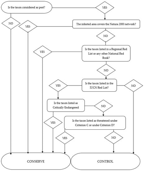 Secondly, we must check whether the species considered as a pest is listed in the IUCN Red List or any other regional red list or national red book. National and regional red lists are high-priority, and taxa listed in a regional or a national list considered to be threatened must be conserved, even if they are listed as NT or LC globally. For example, C. chrysomelinus is listed as NT in the IUCN Red List globally, but is ranked on the red lists of many European countries among strongly threatened species (e.g., [184,185,186,187]), so it must be conserved in these countries regardless of the damage it causes.