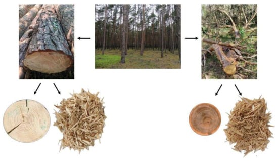 Forests residues (FR) represent a raw wood material which occurs during logging operations in both mature stands and thinning interventions [3,4]. Forest residues that are eligible for further use include branches, with needles and leaves, and tree tops, as well as undersized or damaged stem parts [5]. FR is usually left to decompose naturally or for the local population, for domestic heating purposes [5,6,7]. However, FR has the potential to be a suitable renewable source of energy also at the industrial scale [8]. While searching for alternative uses of a given raw material, it is necessary to take into account the three pillars of sustainable development, which are environmental, social, and economic aspects [9]. According to estimates, the amount of forest residues available for further use in Polish forests ranges from a few to several million cubic meters [10,11]. The average share of FR in the total mass of harvested wood is about 11% and depends mainly on the fertility of the habitat [6,12]. The average wood volume of forest residues (mainly pine wood residues) in the total harvest was estimated at 37.7 m3/ha [6].