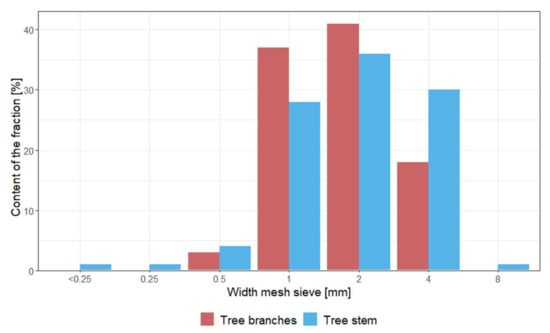 Figure 2 presents the fractional composition of particles from tree stems and branches. The analysis shows that the fractions with the size of 4.0, 2.0, and 1.0 mm represent the largest mass share of particles obtained from the tree stem, respectively 30, 36, and 28%. In turn, for the particles from the branches, the largest fraction came from the 2.0 and 1.0 mm sieves—a total of 72% of the entire particle mixture. Very small amounts of fine particles from the sieve with a mesh smaller than 1.0 mm were observed for the trunk particles it is approx. 7% and for the branches particles approx. 4%.