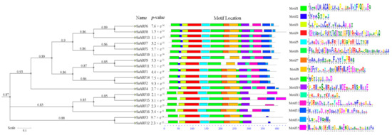 The CDS length of SaARFs is 1771 bp-3322 bp, the encoded protein generally contains 590–1111 amino acids, and the molecular weight ranges from 65.5 kDa to 122.9 kDa. The aliphatic index of SaARF was between 63.77 and 78.33, and the total average hydrophobicity of all SaARF genes was negative, indicating that all SaARF genes were encoded hydrophilic proteins. The protein instability index of SaARF was between 40.67 and 70.11, indicating that all SaARF genes encoded unstable proteins. Wolf PSORT was used to predict the subcellular localization of SaARF, and all SaARFs were found to be located in the nucleus (Table 1). MEME (https://meme-suite.org/meme/tools/meme, accessed on 18 July 2022) was used to analyze the protein sequence of the SaARF gene family, the number of motifs was determined to be 15, and the conserved motifs were analyzed (Figure 1).