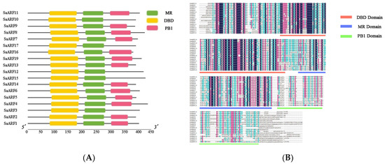 Multiple sequence comparison and conserved domain analysis of the SaARF gene family. (A) The conserved domains of the S. album ARFs protein were analyzed by TBtools, where the DBD domain is shown in yellow, the MR domain is shown in green, and the PB1 domain is shown in red. (B) DNAMAN was used to compare multiple sequences of S. album ARF protein and annotate the conserved domains. The DBD domain is shown in brick red, the MR domain is shown in blue purple, and the PB1 domain is shown in green.