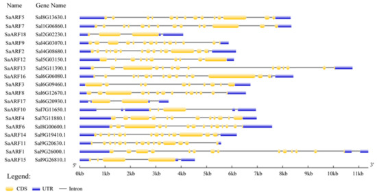 Multisequence comparison of the SaARF gene family was performed by DNAMAN software. CD Search in the National Center for Biotechnology Information (NCBI) search domain (https://www.ncbi.nlm.nih.gov/Structure/cdd/wrpsb.cgi, accessed on 18 July 2022) has been the conservative structure prediction with its conservative structure domain. After CD Search was used to predict the conserved domains of 18 SaARFs, SaARF3, SaARF10, SaARF12, SaARF15 and SaARF17 were found to contain only two conserved domains, while the C-terminal PB1 domain was missing. The remaining 13 SaARFs all contained three conserved domains. They are DBD, MR and PB1, respectively (Figure 2A,B). Gene structure analysis, including CDS, UTR, and intron, was performed by GSDS2.0 (http://gsds.gao-lab.org/index.php, accessed on 16 August 2022) (Figure 3).