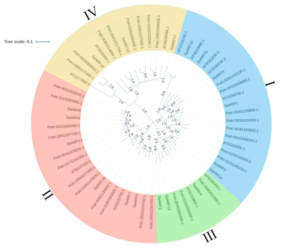 Phylogenetic relationships of ARF gene family members in Arabidopsis thaliana, Populus trichocarpa and sandalwood. The MEGA X program in the NJ connection method was used to construct a phylogenetic tree, which was used to perform beautification (https://itol.embl.de/itol.cgi, accessed on 16 August 2022).