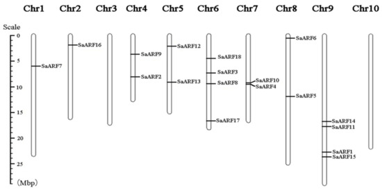 The chromosome location map of the S. album ARF gene was drawn using the MapDraw program, the gene name was marked on the right side of the chromosome, and the chromosome length unit was Mbp.